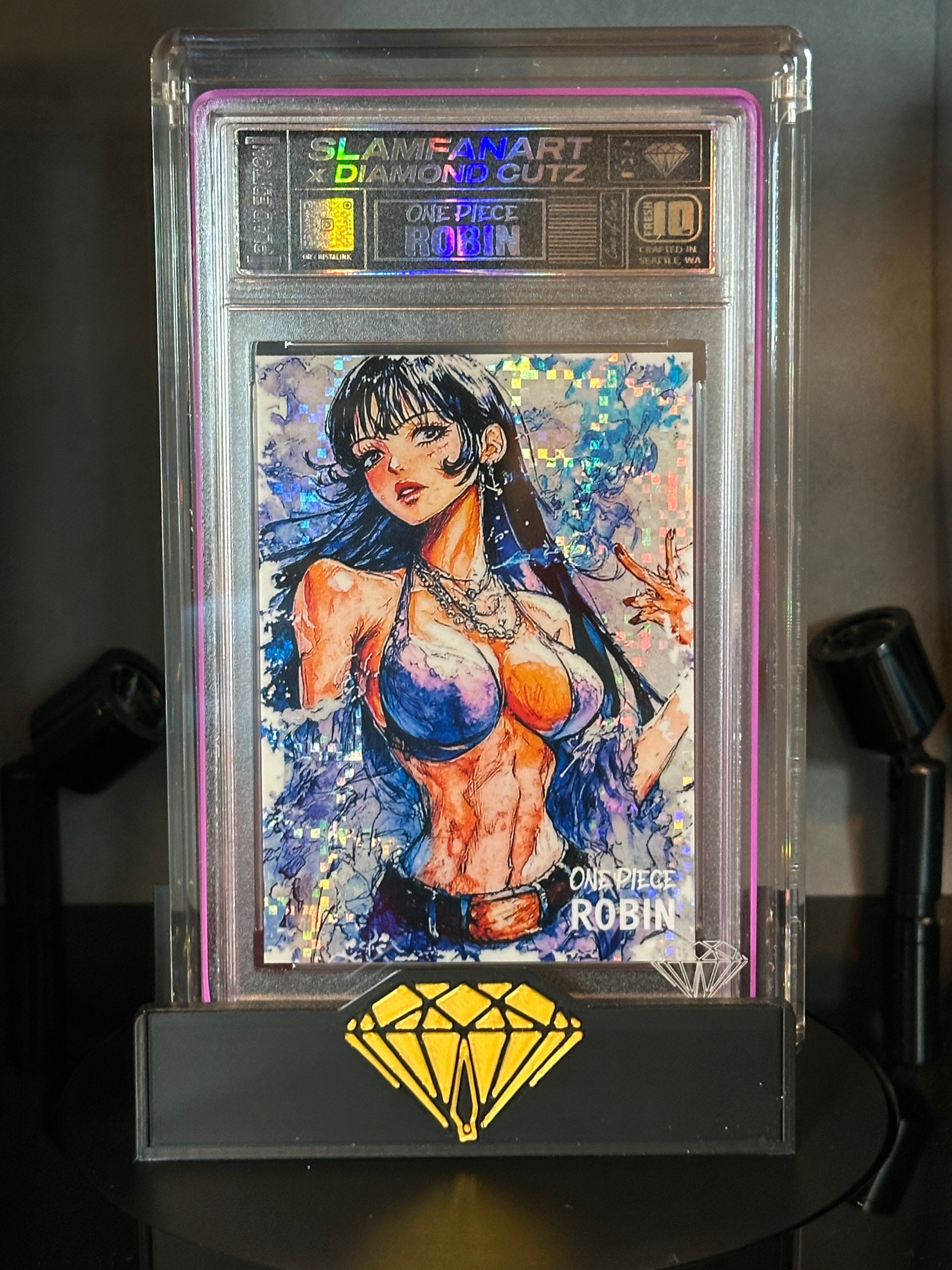 The art is securely encased in a premium acrylic card slab, offering a sleek and modern display while providing ultimate protection. The slab is sealed with precision using an ultrasonic welder, ensuring a secure, airtight enclosure that preserves the integrity of the print for years to come.